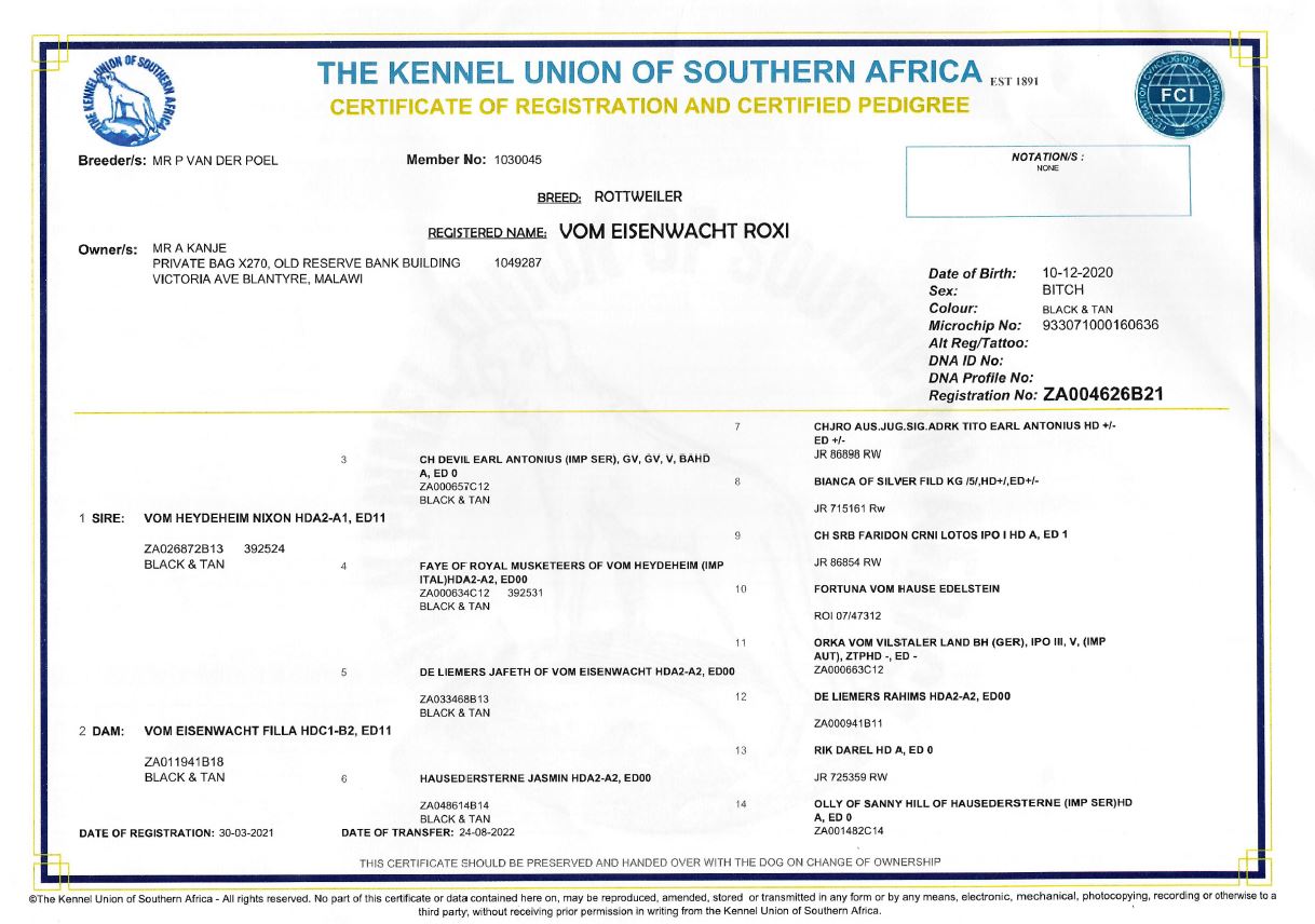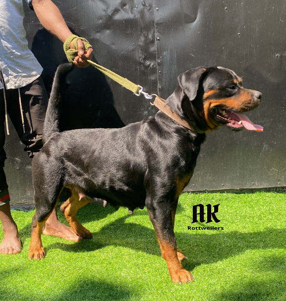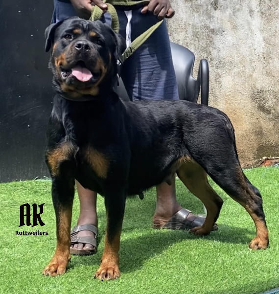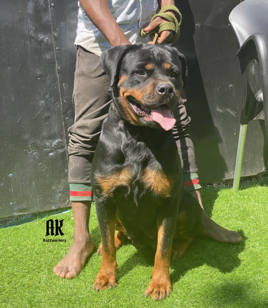 Mundo is the direct grand daughter of Multi V rated Champion Devil Earl Antonius of South Africa and Great Grand Daughter of the Famous World Champion ADRK Tito Earl Antonius from Italy. She poses a very good temperament, she is a calm girl and loves the company of children. When it comes to looks, she is very beautiful that she poses the head of her fore fathers with dark colored brown eyes. She as the perfect angulation , straight topline and short coat as a Rottweiler is supposed to be. She has black and with butterfly tan markings on her chest. She is a perfect family dog one can have.