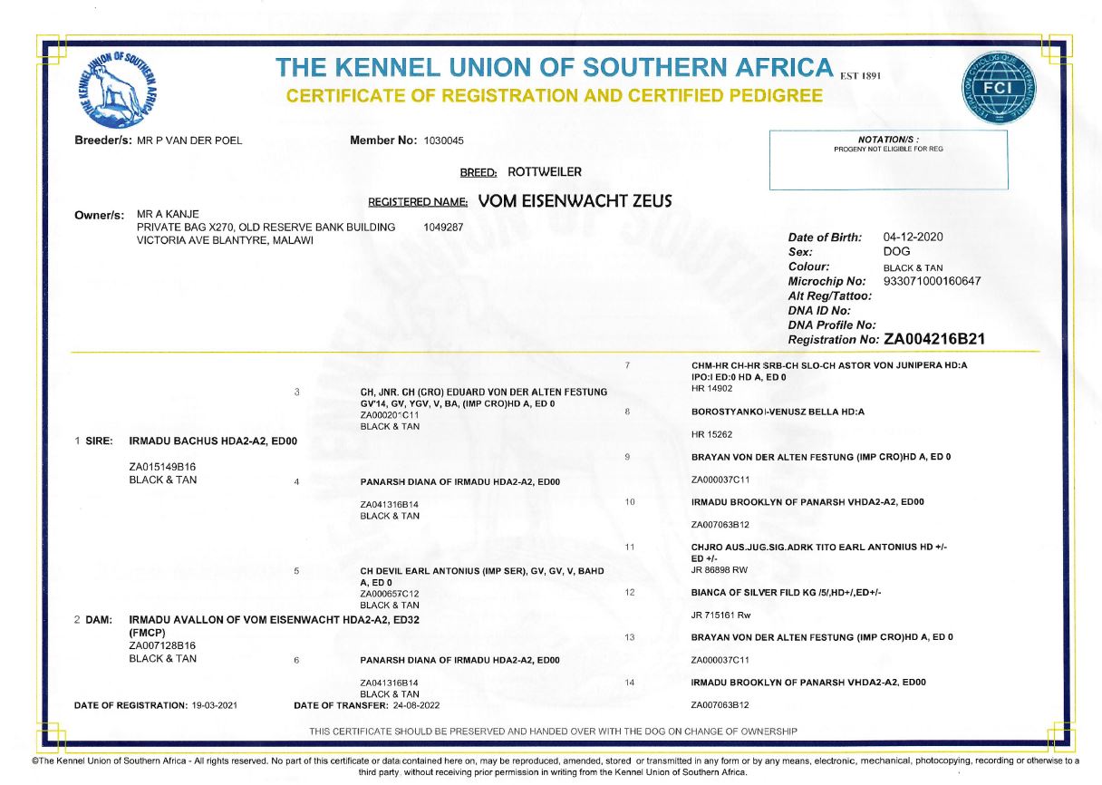 AK Rottweiler Vamos is a 2 - 2 Line breeding of Champion Devil Earl Antonius the only son of World Champion Tito Earl Antonius that become junior champion together with his sitter Diva. When Vamos was born we could see it from his eyes that he was not a regular son of Boika but the only son that has looked much closer with Devil Earl Antonius. He is a well balanced dog and acts when he needs to act just like the sword himself. He is good with children and we have chosen to include him in our stud book for a future possible combination of a granddaughter of Lex Vom Edelstein. The head is just fascinating we are hoping to see what we like to see in his future offspring (The power of progeny). Vamos just like his father AK'S Boika is the dog that would pass BH and ZTP tests without no doubt.